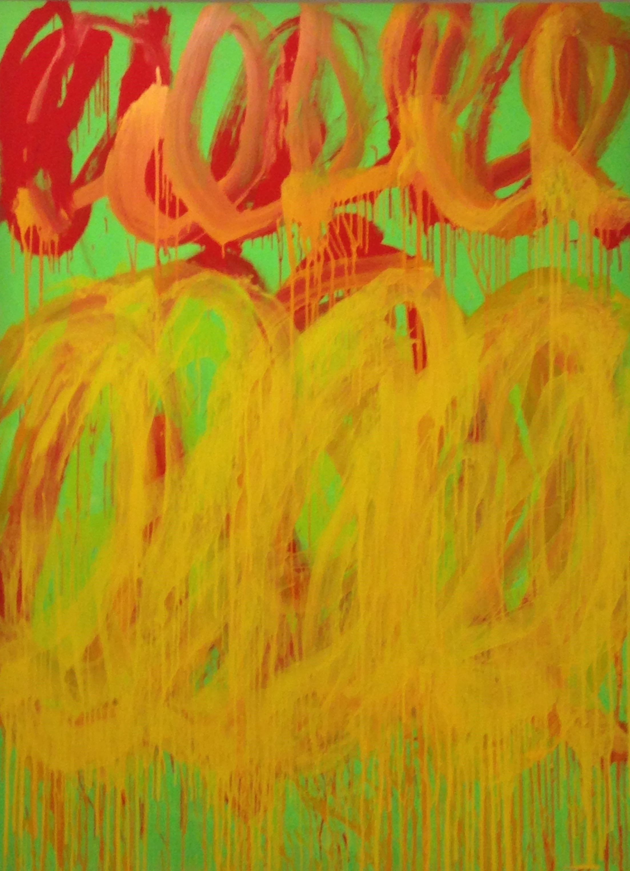 Les peintures de sa série « Camino Real » (1ère photo), commencées en 2010 et achevées en 2011 (année de sa mort), sont époustouflantes avec leurs lignes de boucles irrégulières rouges, jaunes, orangées sur fond vert. Un véritable coup de cœur ! Tout est là, parfaitement maitrisé : boucle, trait, couleur.