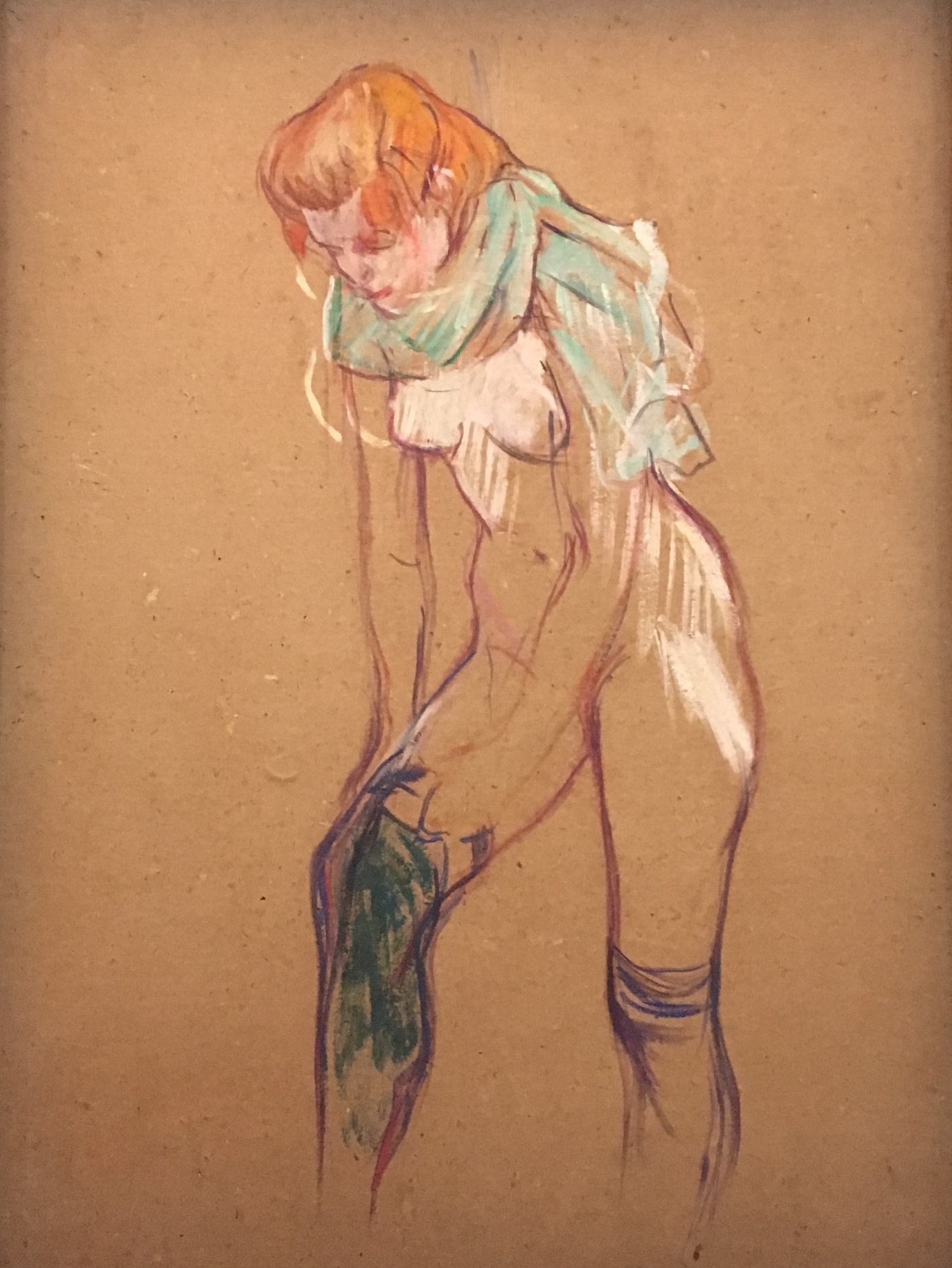 Les peintures de TL consacrées aux maisons closes et aux prostituées sont incroyables de puissance et impitoyables de réalisme pathétique.. Elles racontent le quotidien et l’intime de ces femmes « de joie » mis en valeur par la touche rapide et nerveuse de l’artiste. Impossible d’être indifférente. « Femme qui tire son bas » (photo 9) m’a subjuguée. Peut-être parce qu’il y a encore une certaine fraicheur dans le modèle ?