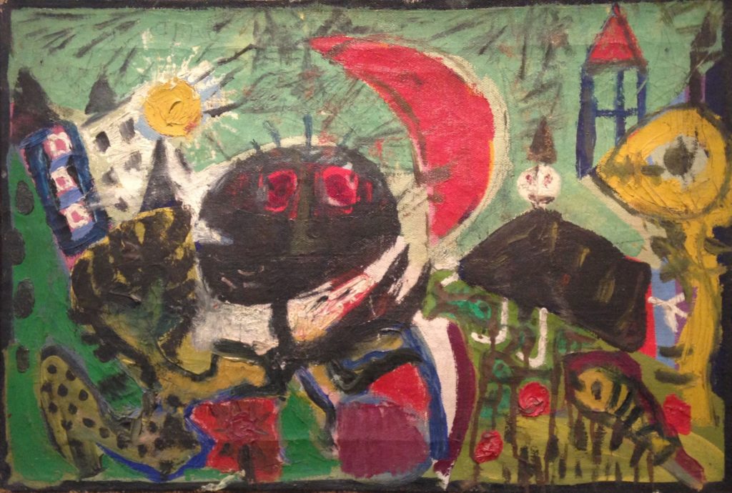 Les artistes cofondateurs de CoBrA (Constant, Corneille, Asger Jorn, Karel Appel, Erik Nyholm…) apprécient de travailler de concert. Ainsi, lors d’une « virée » chez le céramiste et éleveur de truites Erik Nyholm, ils réalisent cette œuvre symptomatique des nombreuses collaborations entre les différents artistes de CoBrA. Nos différents lascars profitent de leur séjour pour décorer entièrement la maison de leur hôte. J’aurais aimé voir le résultat !