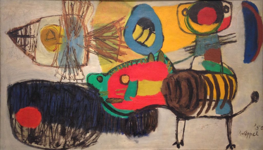 Karel Appel est né en 1921 à Amsterdam, où il a étudié les Beaux-Arts durant la guerre. Dès 1946, il commence à exposer, avant de s’installer en 1950 à Paris. La seconde guerre mondiale vient juste de se terminer, avec son cortège d’horreurs qui, au fil des jours, est révélé au grand jour.